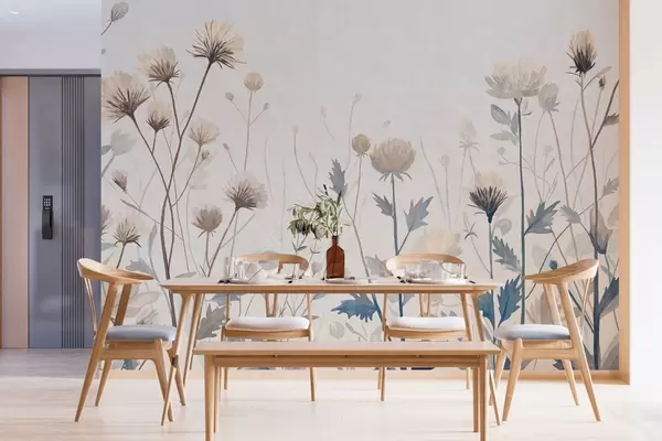 Wall Mural Photo Wallpaper Wild field grasses and flowers painted in a scenic style against a light background Nr. w05563