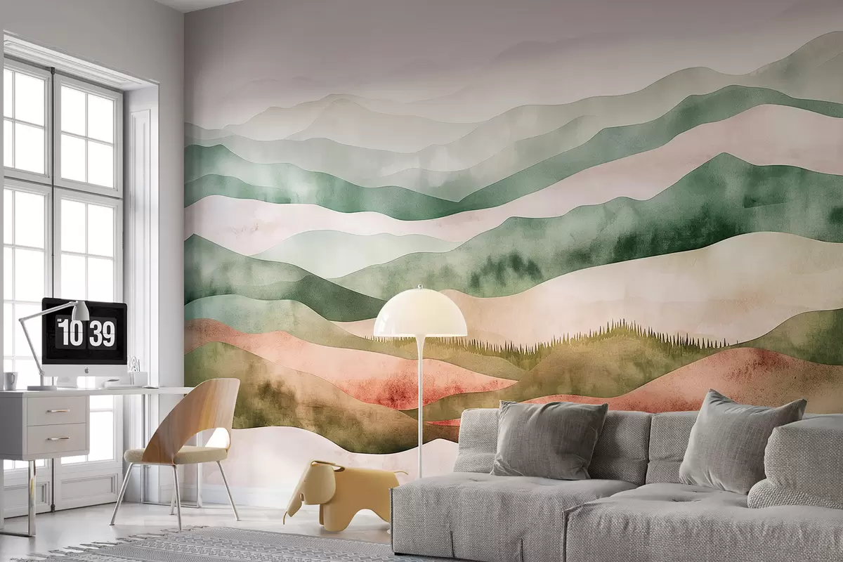 Wall Mural Photo Wallpaper Watercolor mountains landscapes, forest, nature, green and beige colors Nr. w07950v1
