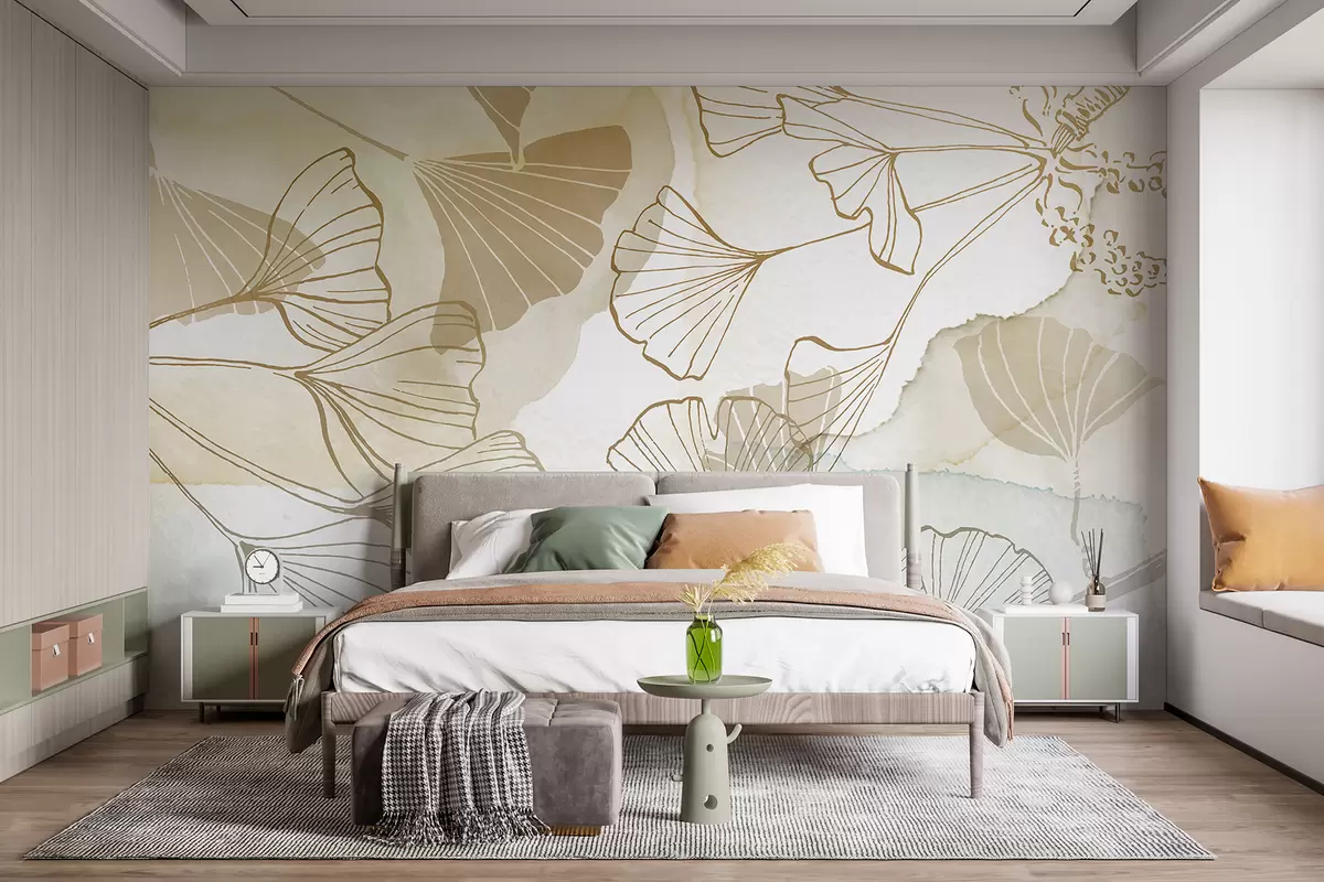 Wall Mural Photo Wallpaper A pattern of delicate ginkgo leaves in shades of beige, tan, and blue against a light background Nr. w08157