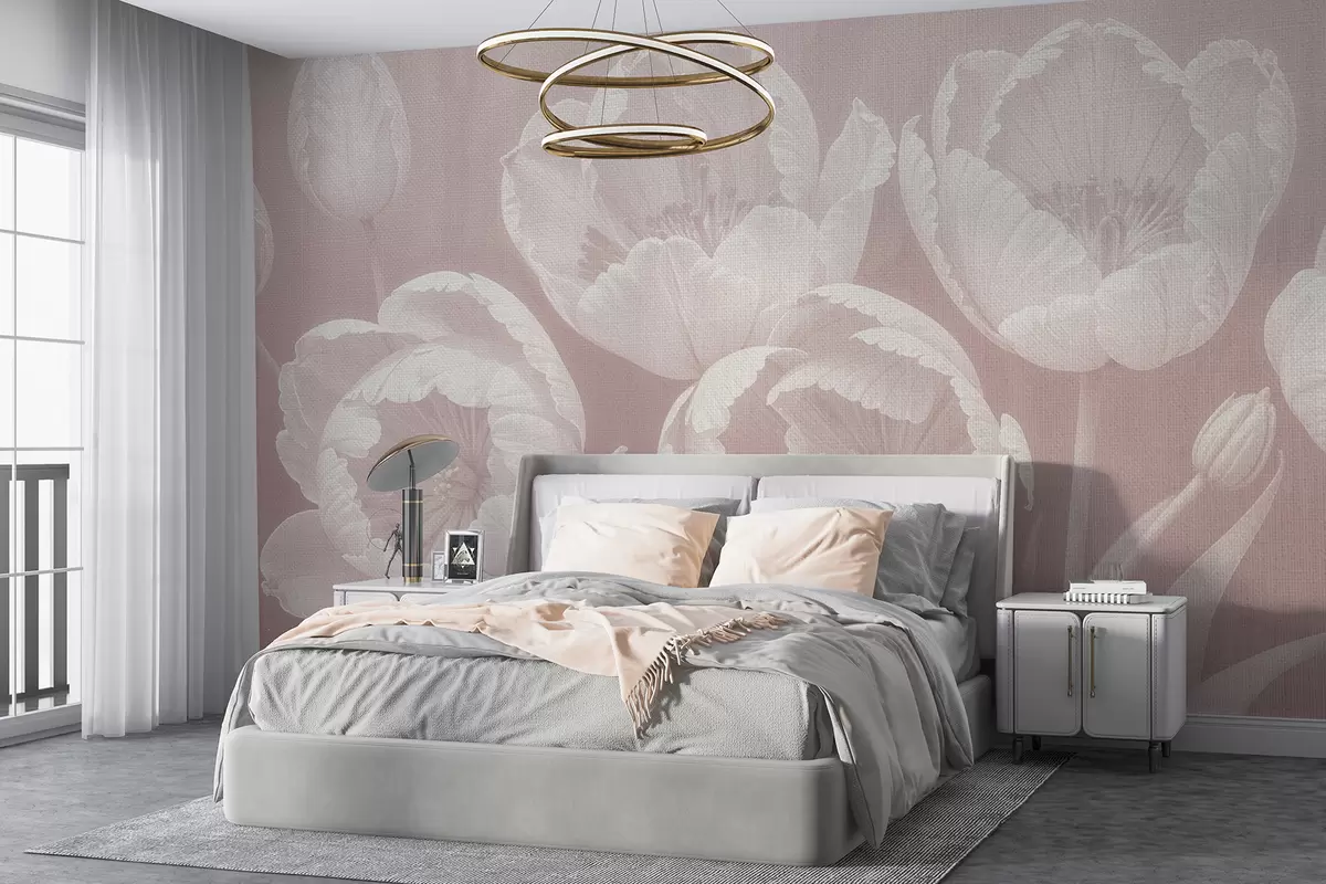 Wall Mural Photo Wallpaper Drawing of white tulips with soft, canvas textured beige blurred background minimalism monochrome print Nr. w08193