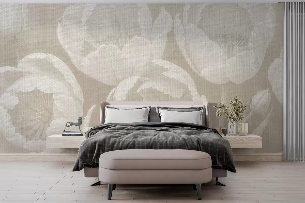 Wall Mural Photo Wallpaper Drawing of white tulips with soft, canvas textured pink blurred background minimalism monochrome print Nr. w08193v1