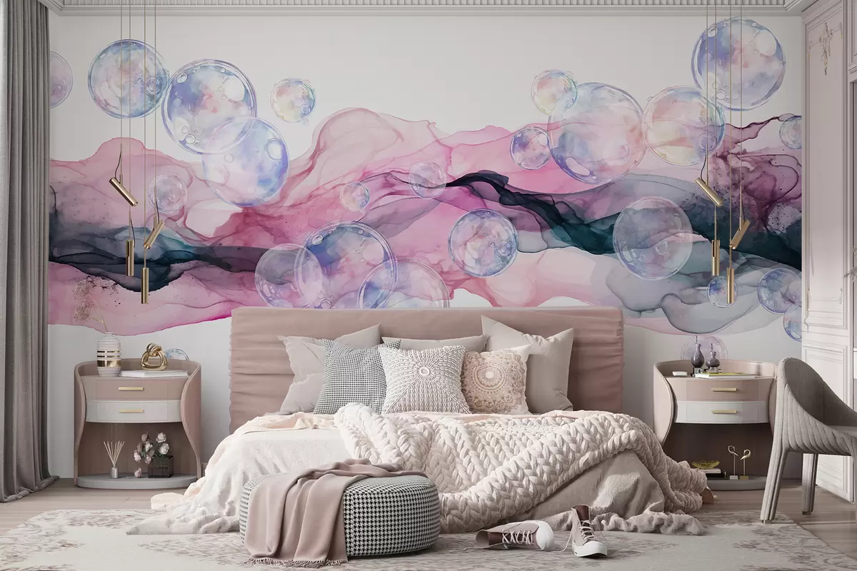 Wall Mural Photo Wallpaper Colorful abstract fluid shapes with bubbles, swirls of pink, blue, and purple hues against a white background Nr. w08337