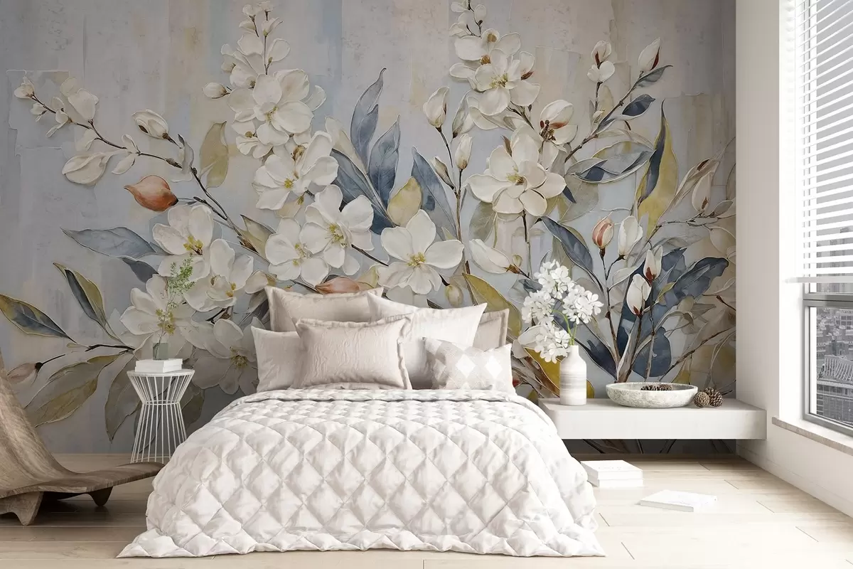 Wall Mural Photo Wallpaper Floral pastel delicate white flowers with yellow centers, surrounded by lush green leaves and branches Nr. w08399v1