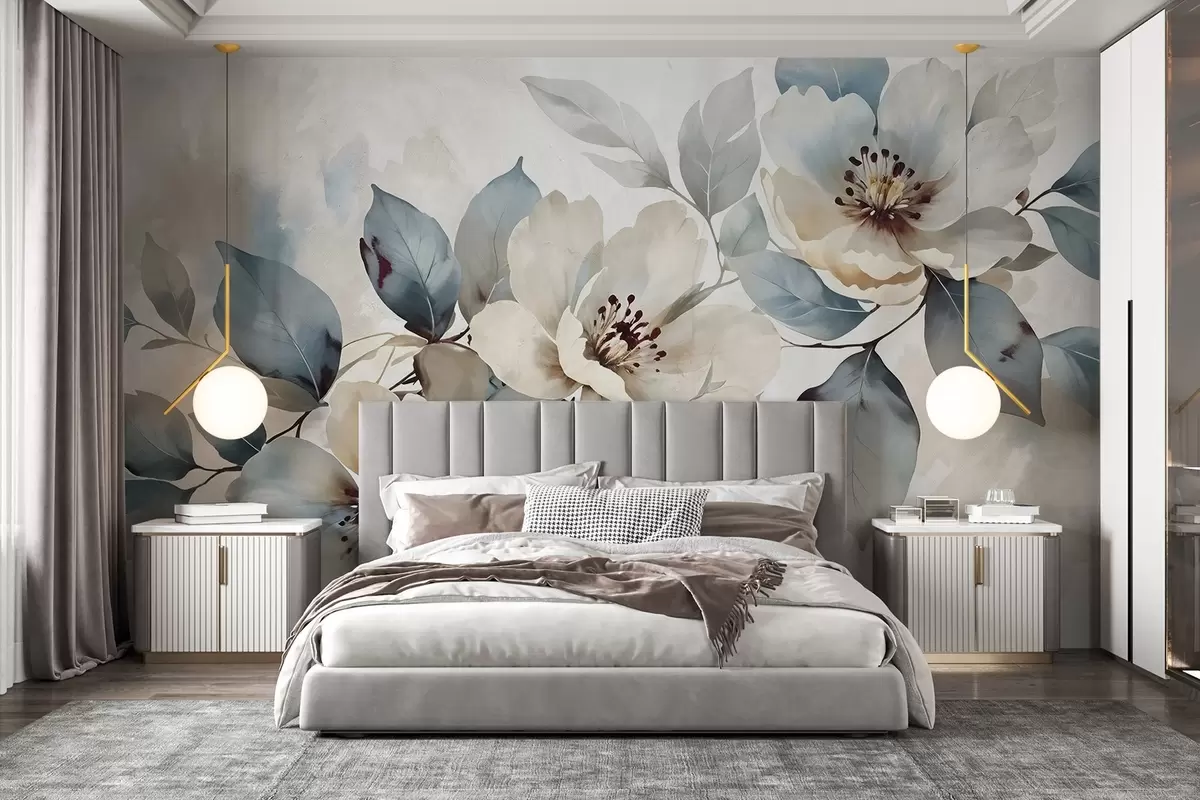 Wall Mural Photo Wallpaper Delicate watercolor textured white and blue floral arrangement, with soft petals and centers Nr. w08401