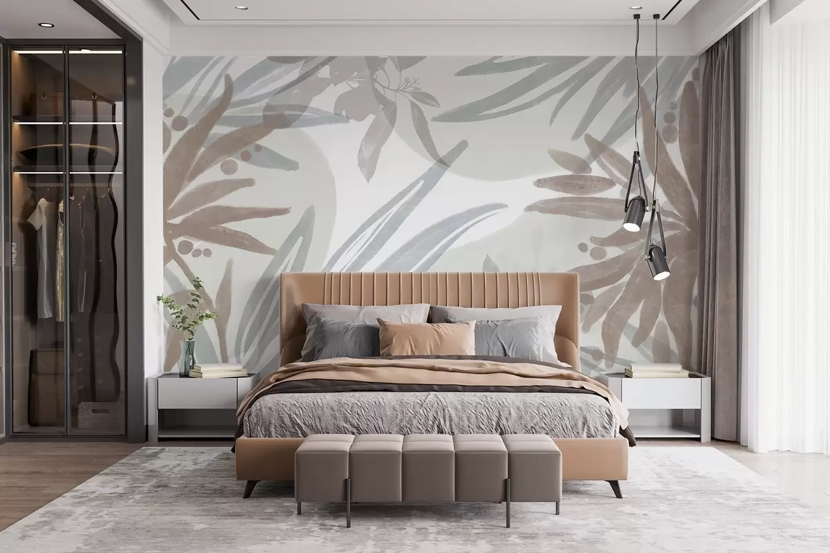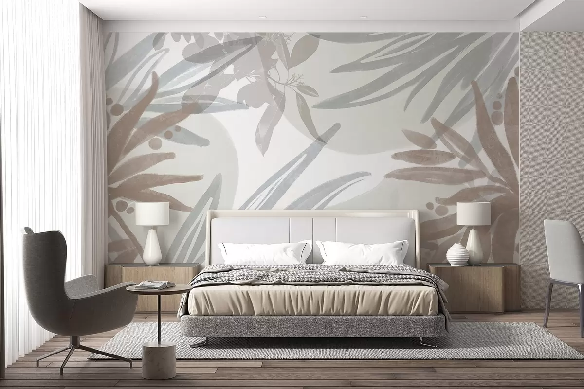 Wall Mural Photo Wallpaper A neutral-toned abstract floral pattern with overlapping leaves and shapes in shades of gray , white , and beige Nr. w08464