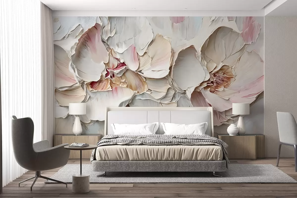 Wall Mural Photo Wallpaper Delicate, pale pink flowers with soft, layered petals on a muted, textured background impasto oil painting imitation Nr. w08467