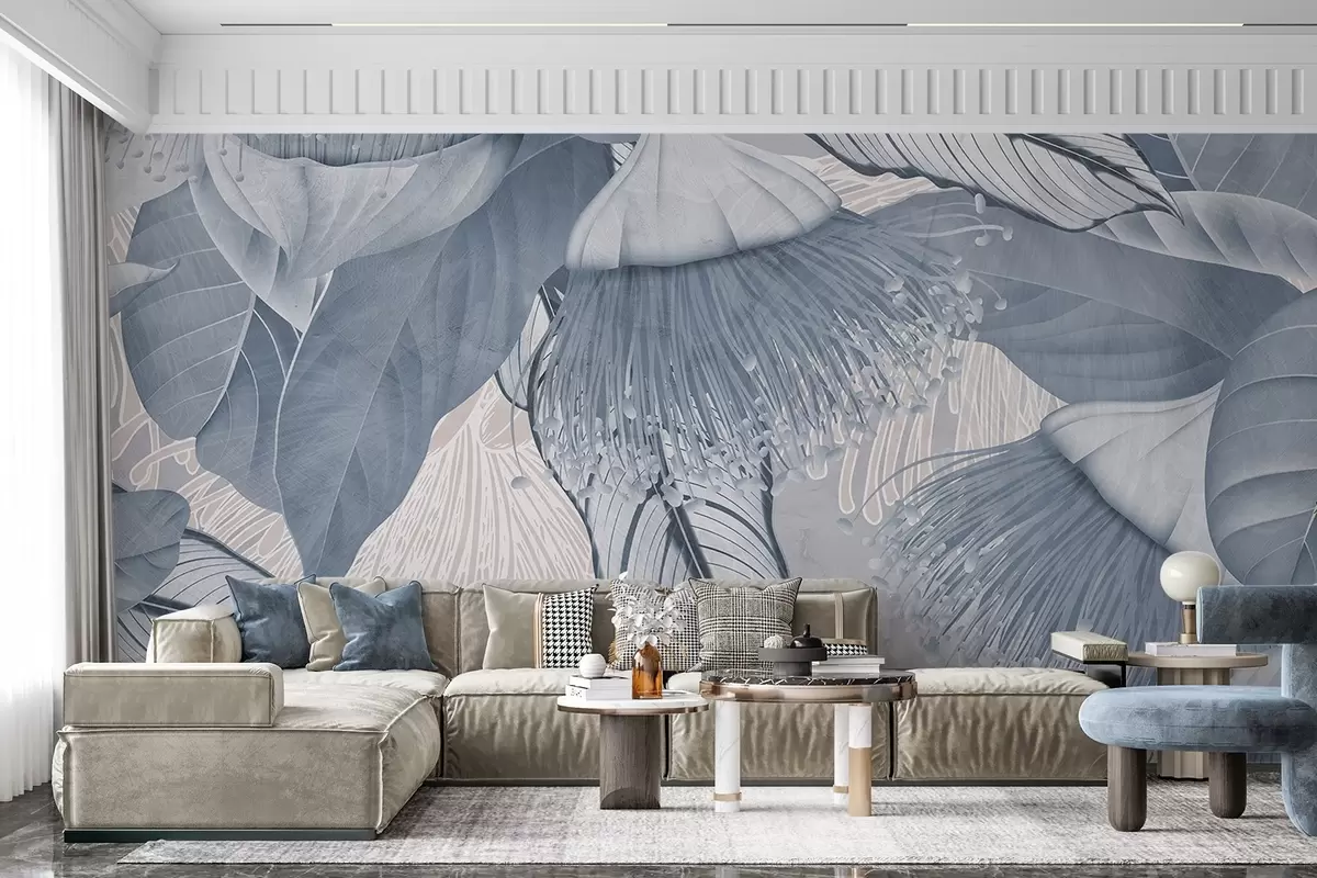 Wall Mural Photo Wallpaper Botanical illustration of large, blue eucaliptus flowers with long stamens against a gray and white background Nr. w08539v1