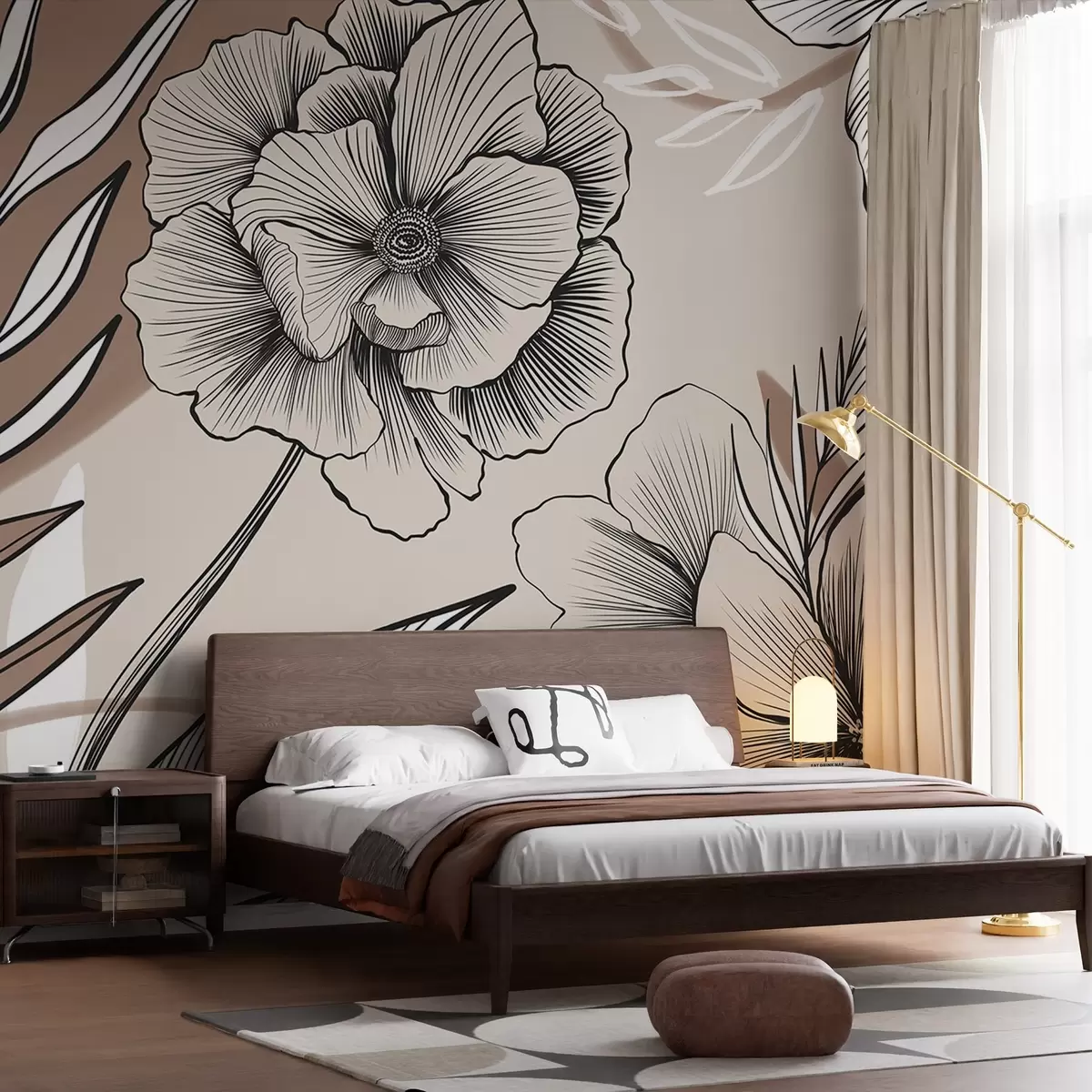 Wall Mural Photo Wallpaper Large black and white graphic flowers with detailed leaves on a beige abstract background Nr. w08580