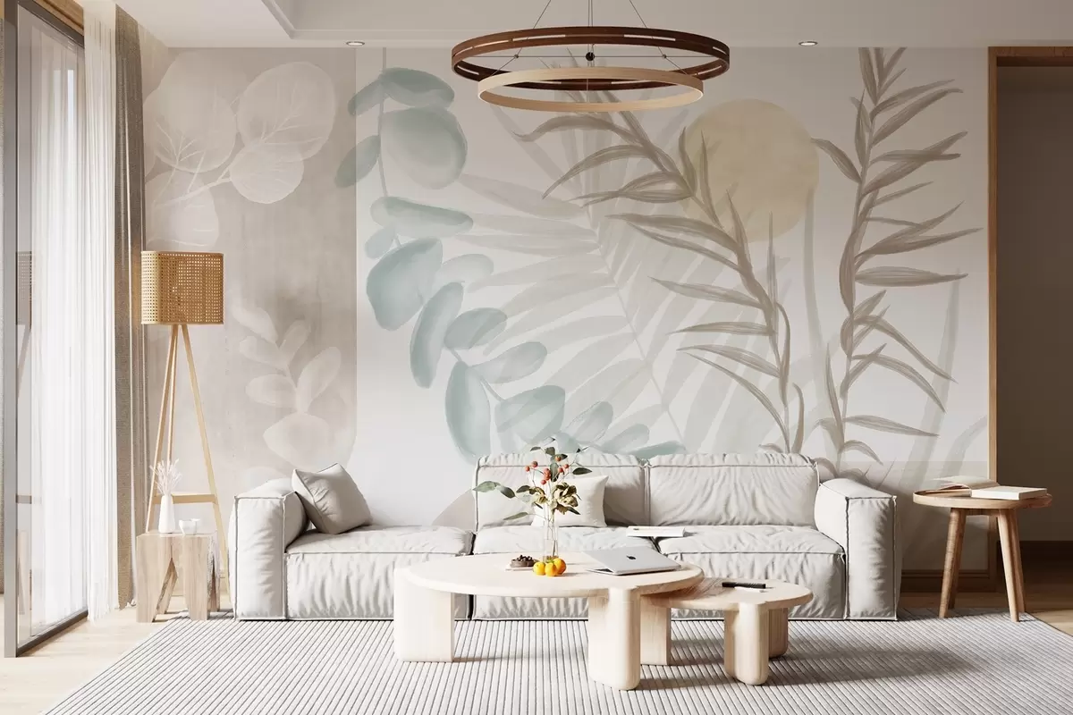 Wall Mural Photo Wallpaper A minimalist abstract print with stylized leaves and eucaliptus with soft, beige organic shapes in muted pastel colors Nr. w08648