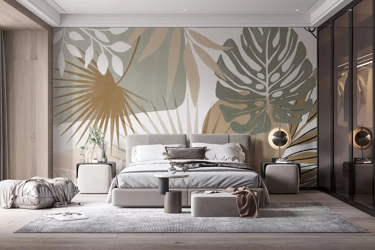 Wall Mural Photo Wallpaper Abstract design featuring various tropical leaves and in earthy tones of green, beige, and cream Nr. w08738v1