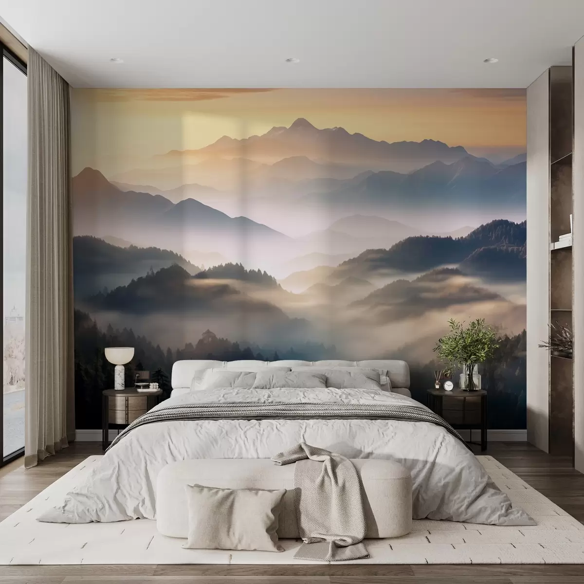 Wall Mural Photo Wallpaper Serene mountain landscape at dawn, with soft mist enveloping the pines Nr. w08748