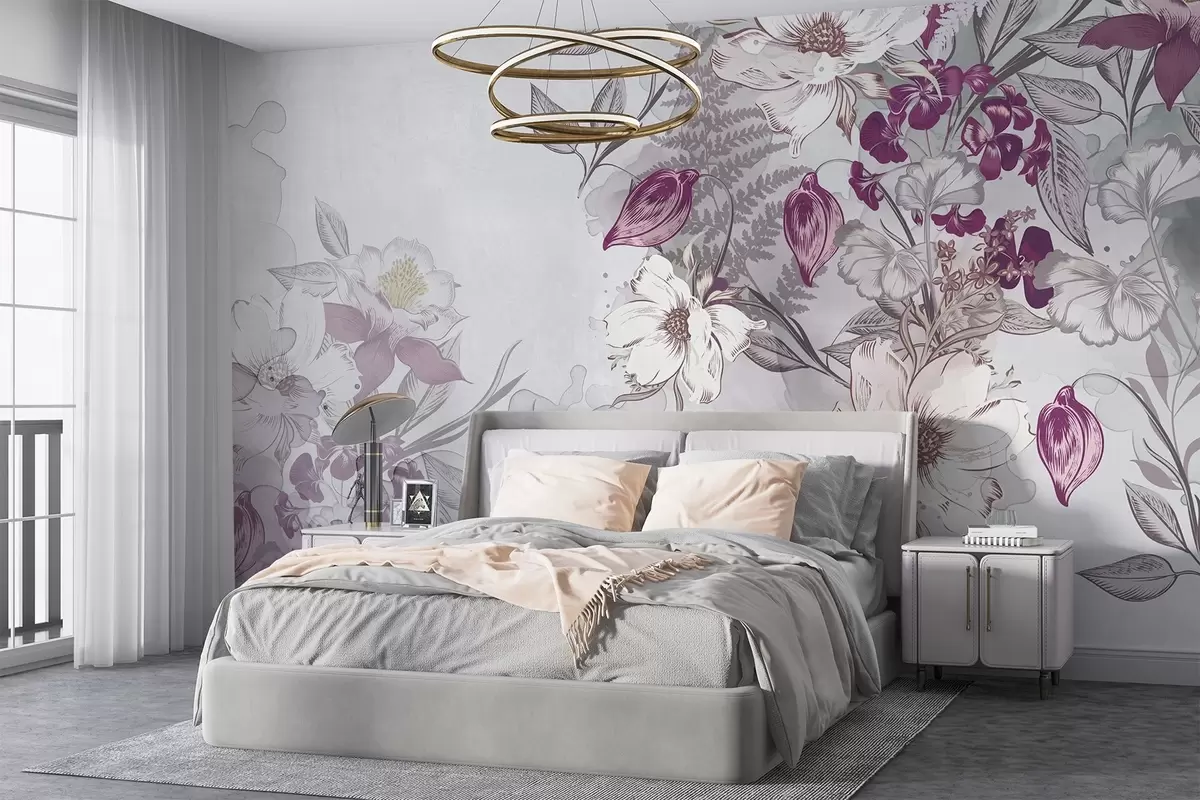 Wall Mural Photo Wallpaper Flowers with white and purple petals, leaves and stems , watercolor effect , light gray textured background Nr. w08899