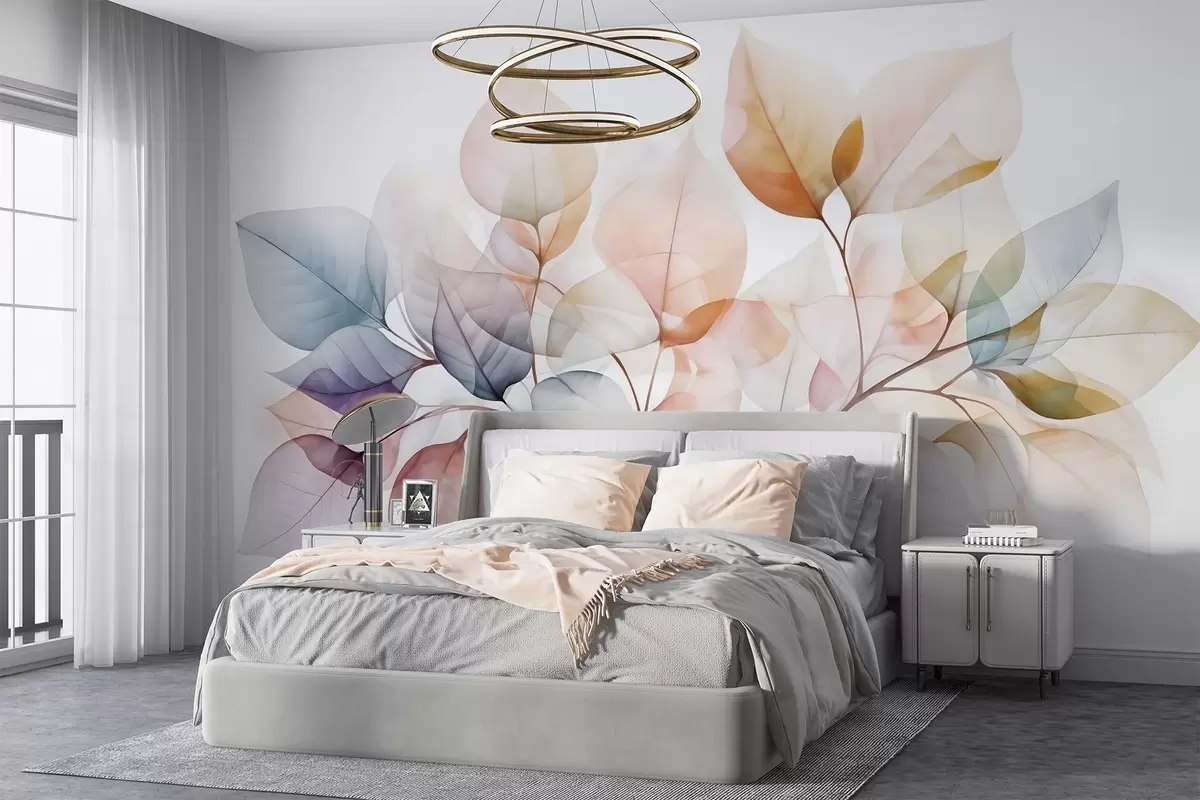 Wall Mural Photo Wallpaper Watercolor painting of translucent leaves in pastel colors, with shades of pink, white, purple, and blue Nr. w08910