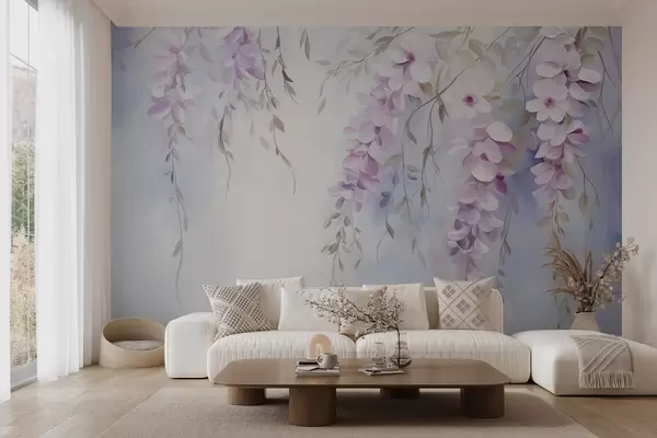 Wall Mural Photo Wallpaper Wisteria flowers with lilac petals and green leaves hanging from branches, soft pastel colors, pastel colored background Nr. w09010