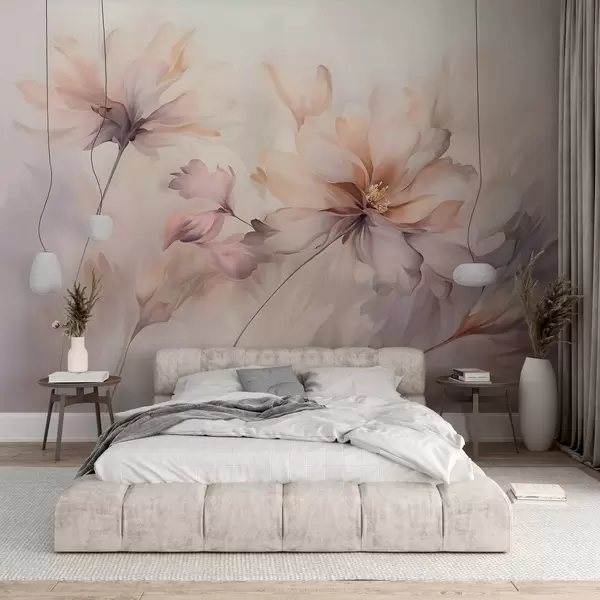 Wall Mural Photo Wallpaper A delicate floral art with large pastel-colored flowers with translucent petals, soft stems, and a gentle diffused background Nr. w09050