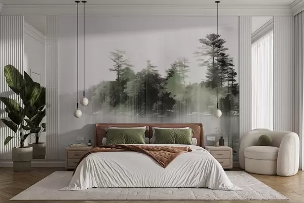 Wall Mural Photo Wallpaper Abstract minimalism textured landscape with a lake and trees reflections in the water in green and white shades Nr. w09058
