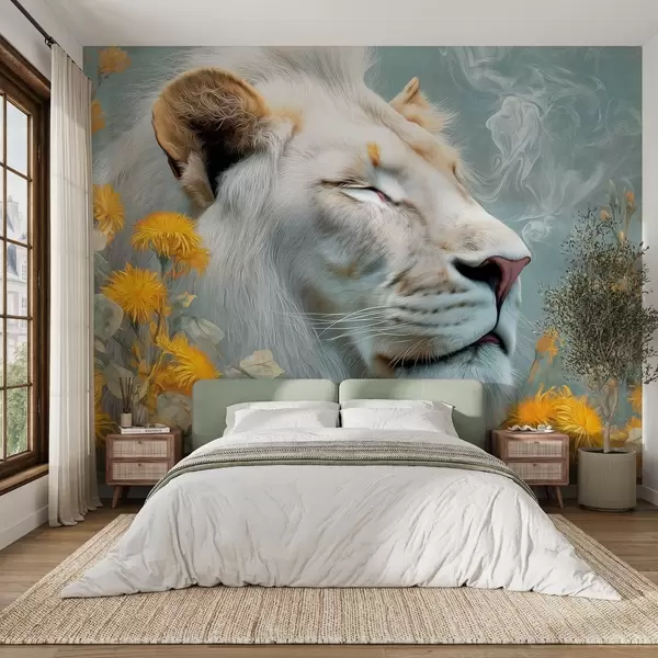 Wall Mural Photo Wallpaper A white lion surrounded by yellow flowers and smoke Nr. w09080