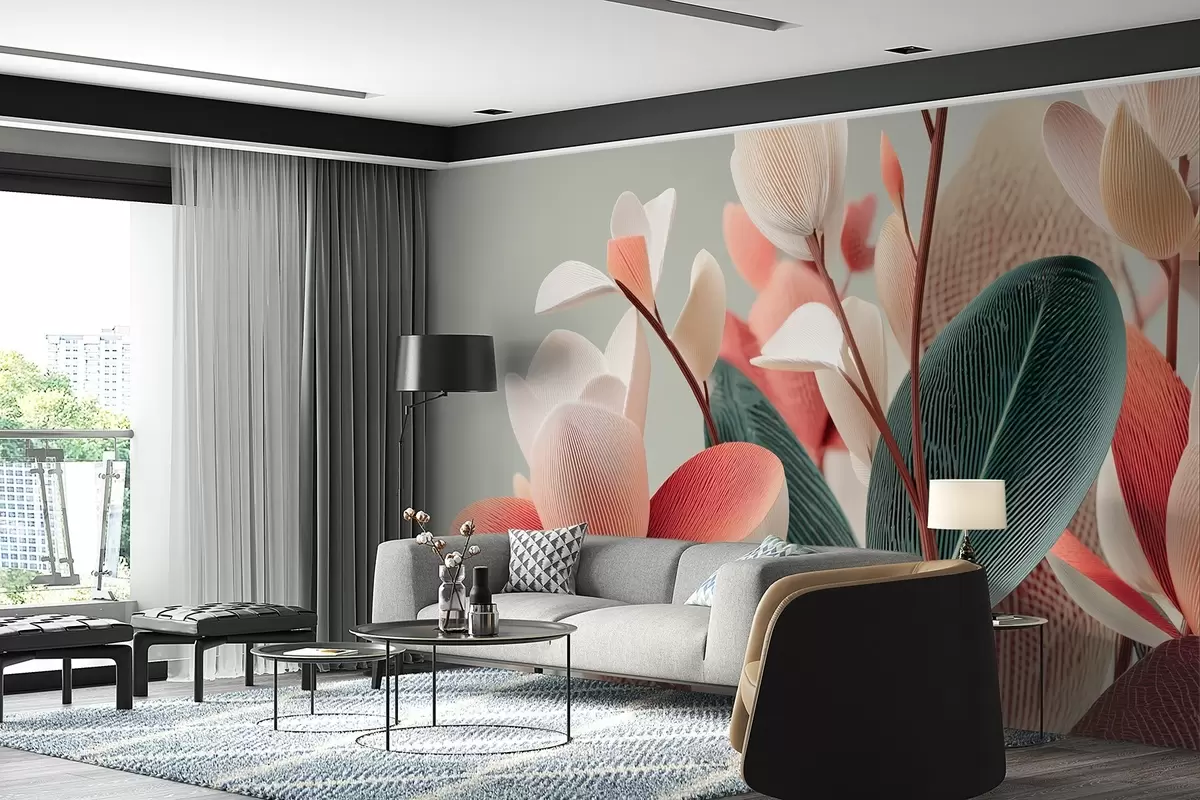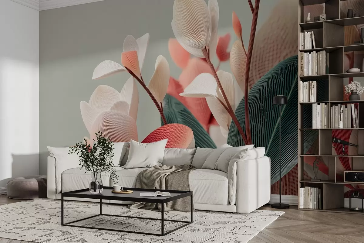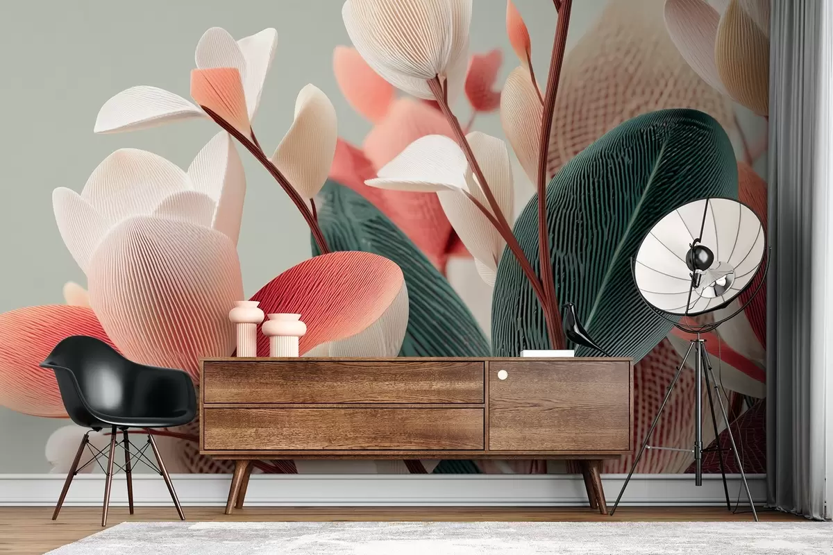 Wall Mural Photo Wallpaper Textured flowers and leaves in pastel and green tones Nr. w09094