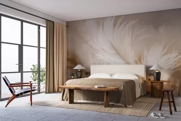 Wall Mural Photo Wallpaper Flying airy feathers on a beige background Nr. w09102