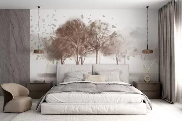 Wall Mural Photo Wallpaper Abstract landscape with trees with brown leaves reflecting in the water, in watercolor textured style Nr. w09109v1