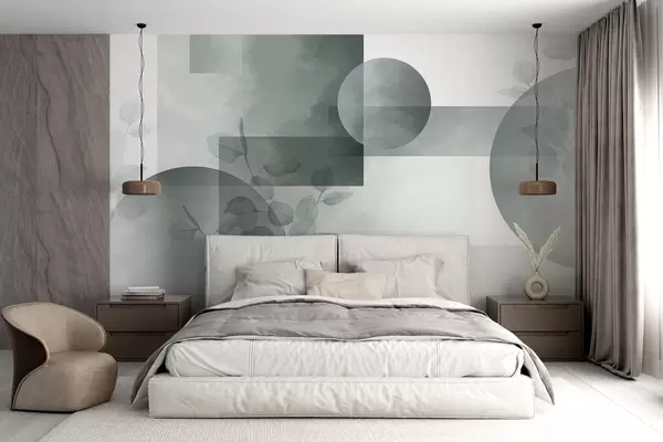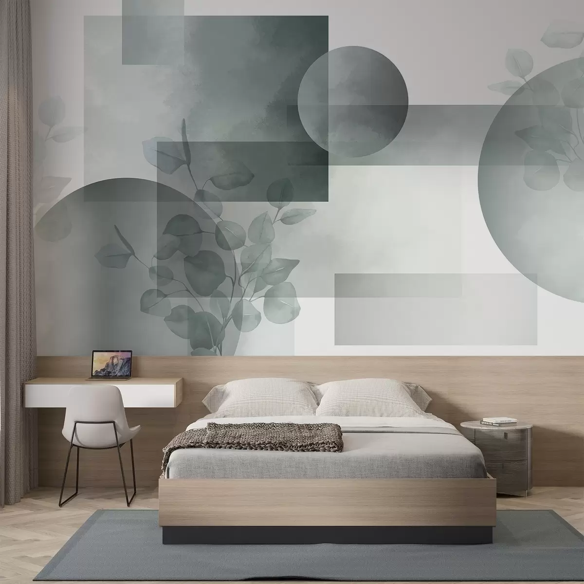 Wall Mural Photo Wallpaper Abstract modern minimalistic geometric design with circles and rectangles, eucalyptus leaves, watercolor effect Nr. w09110