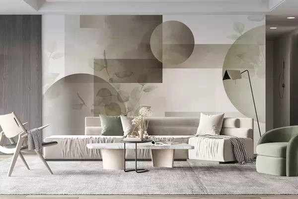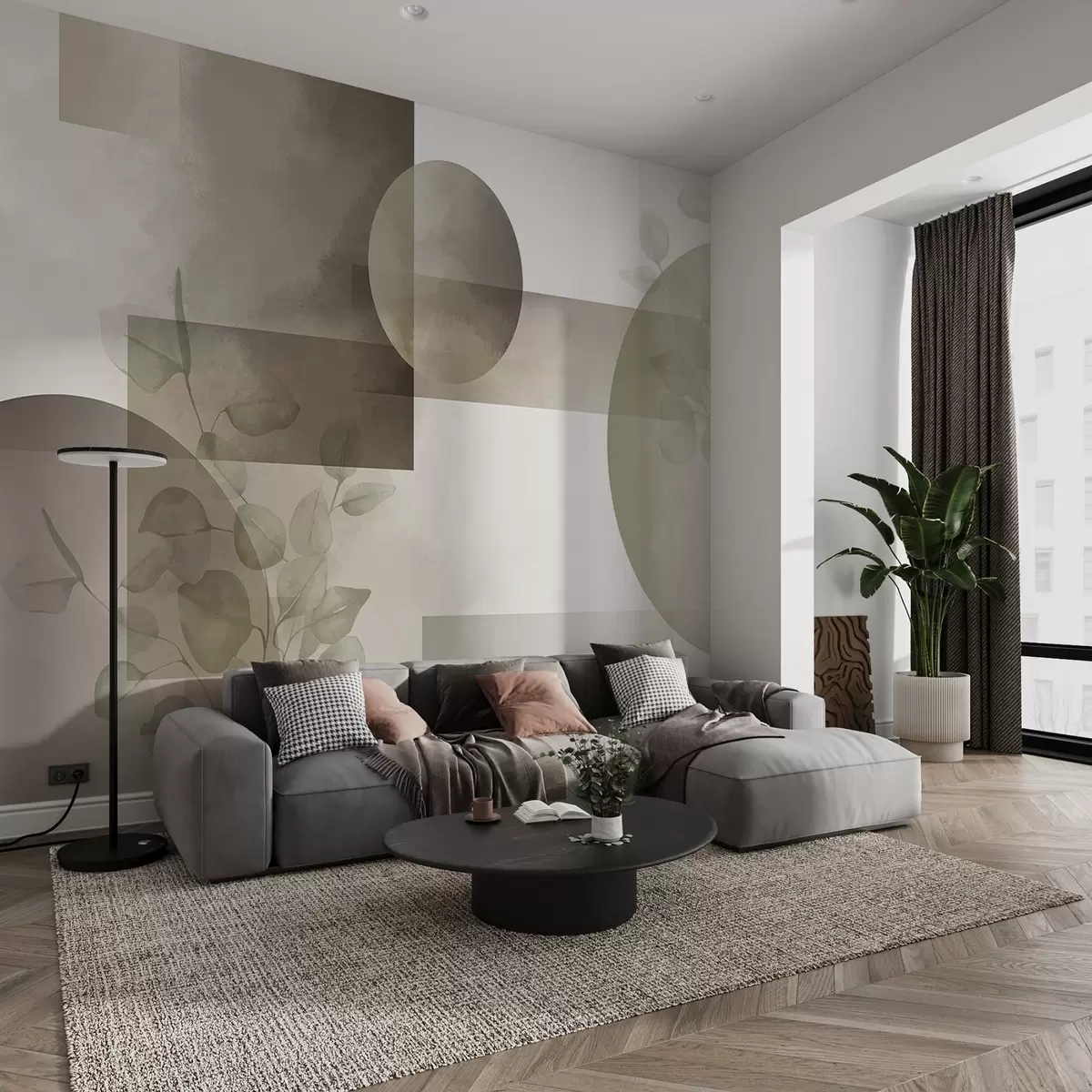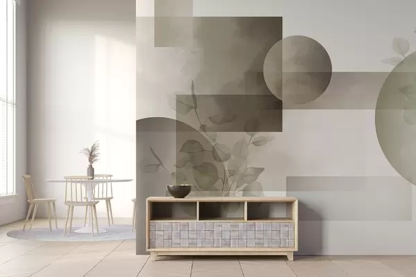 Wall Mural Photo Wallpaper Abstract modern minimalistic geometric design with circles and rectangles, eucalyptus leaves, watercolor effect Nr. w09110v1