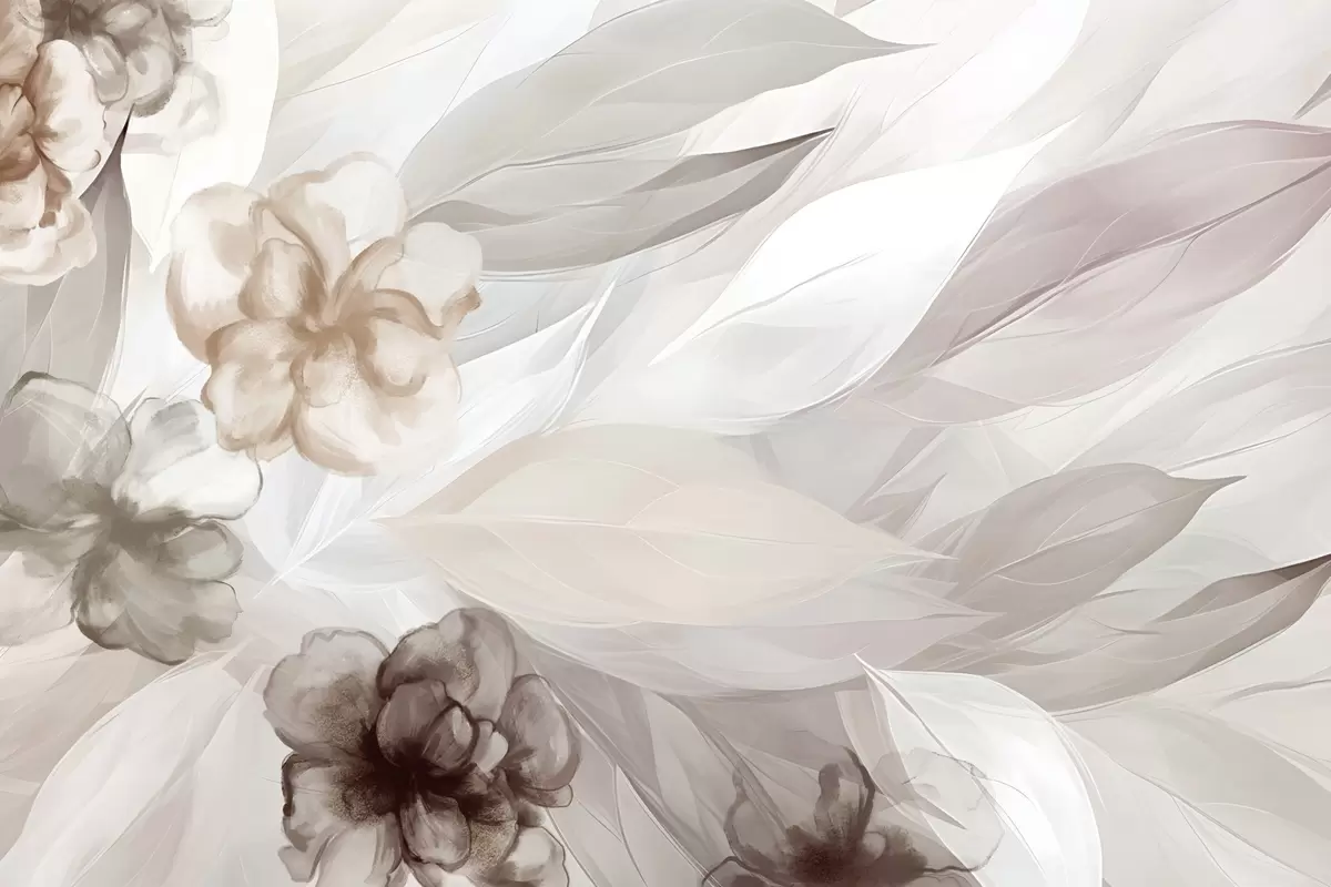 Wall Mural Photo Wallpaper Delicate flowers and leaves in shades of white, brown, and beige floral background , soft colors, delicate petals Nr. w09111v1