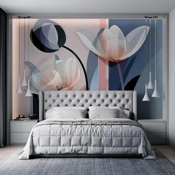 Wall Mural Photo Wallpaper Abstract modern design with tulips with transparent petals in pastel shades of pink, white, and dark blue Nr. w09116