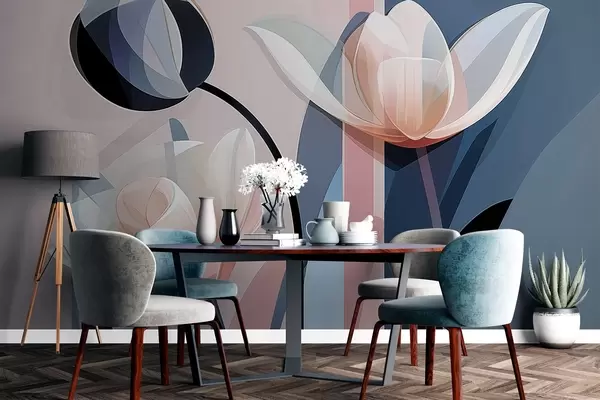 Wall Mural Photo Wallpaper Abstract modern design with tulips with transparent petals in pastel shades of pink, white, and dark blue Nr. w09116