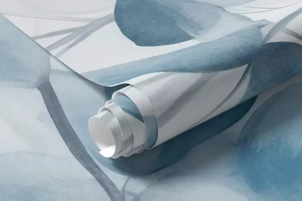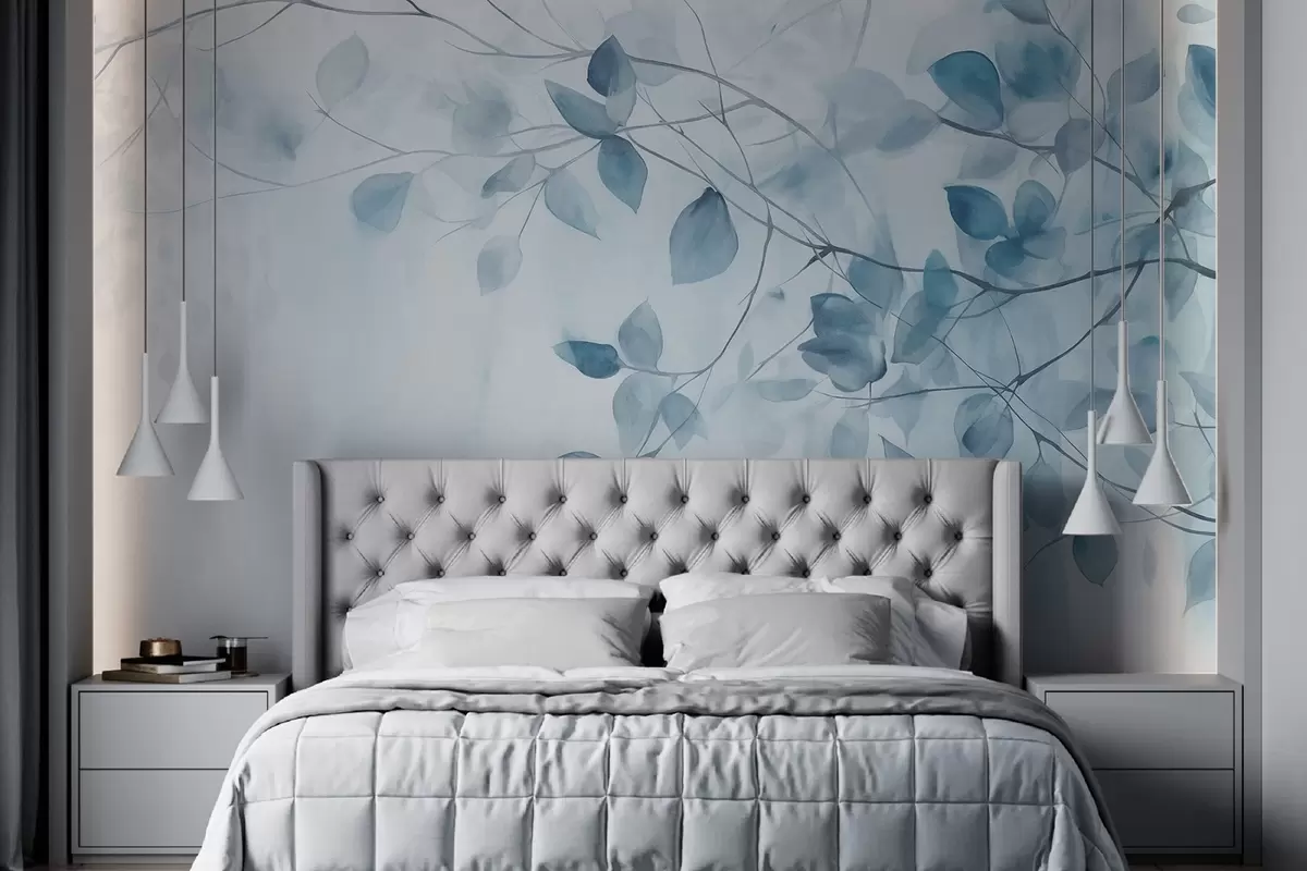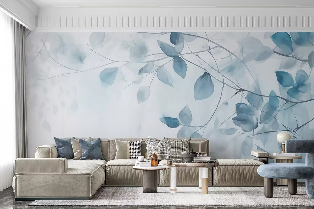 Wall Mural Photo Wallpaper Textural watercolor painting imitation of blue leaves and branches, soft colors, delicate details against a white background Nr. w09133v1
