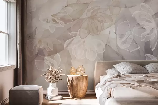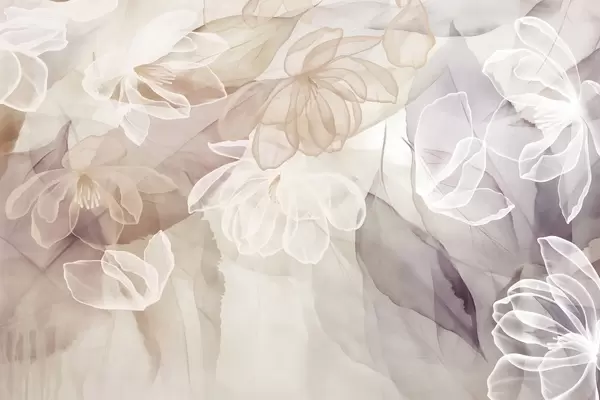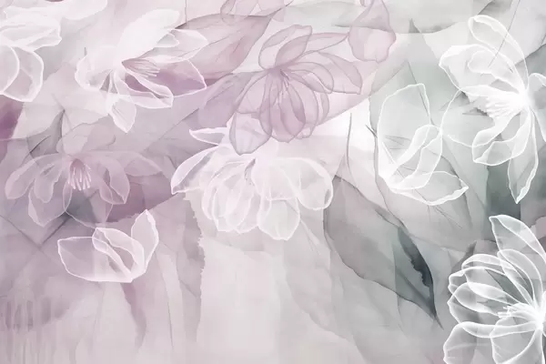 Wall Mural Photo Wallpaper Flowers and leaves with transparent petals in shades of white, beige and purple, soft and delicate Nr. w09158
