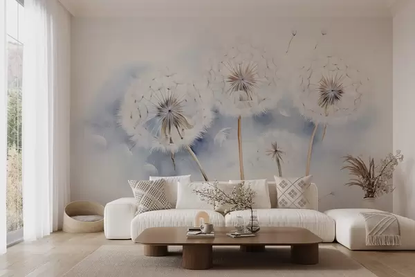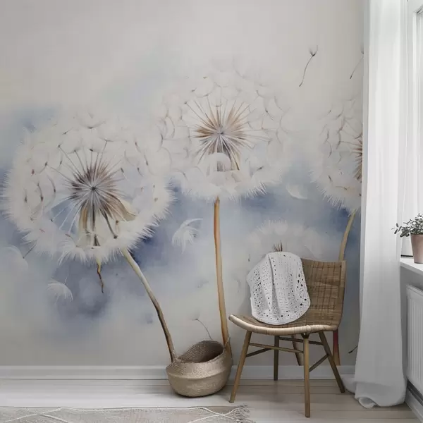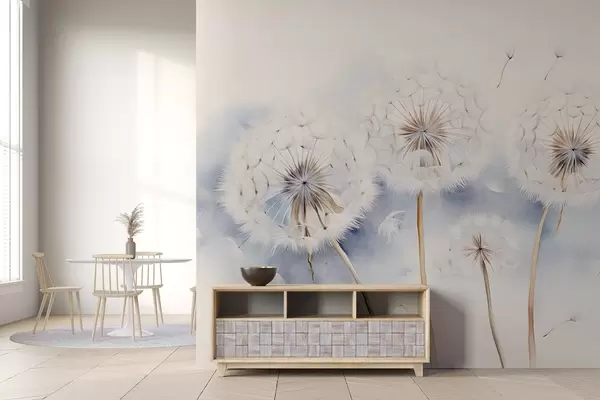 Wall Mural Photo Wallpaper Textured dandelions with seeds floating in the air, light blue and white background, soft delicate drawing style Nr. w09190
