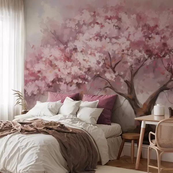 Wall Mural Photo Wallpaper Abstract pink blossom tree in full bloom, next to a river, soft textured brushstrokes and pastel colors Nr. w09193