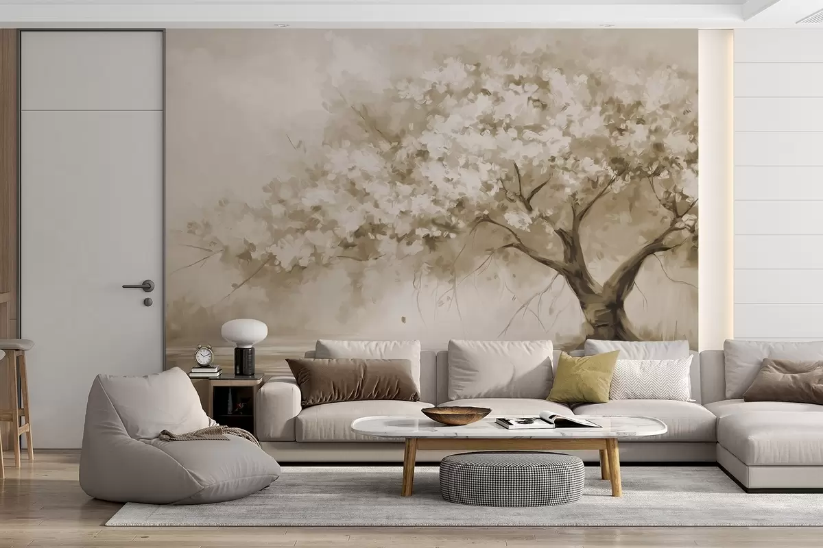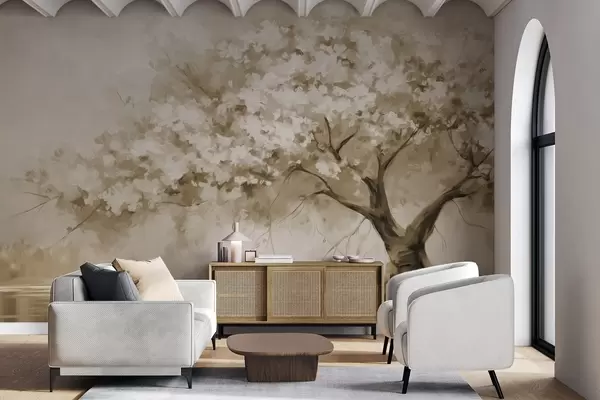 Wall Mural Photo Wallpaper Abstract beige blossom tree in full bloom, next to a river, soft textured brushstrokes and pastel colors Nr. w09193v1