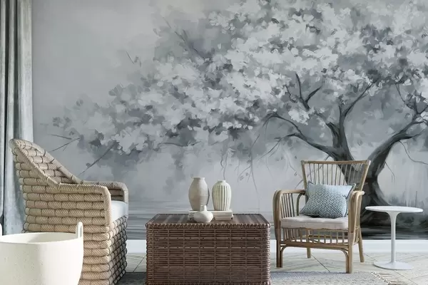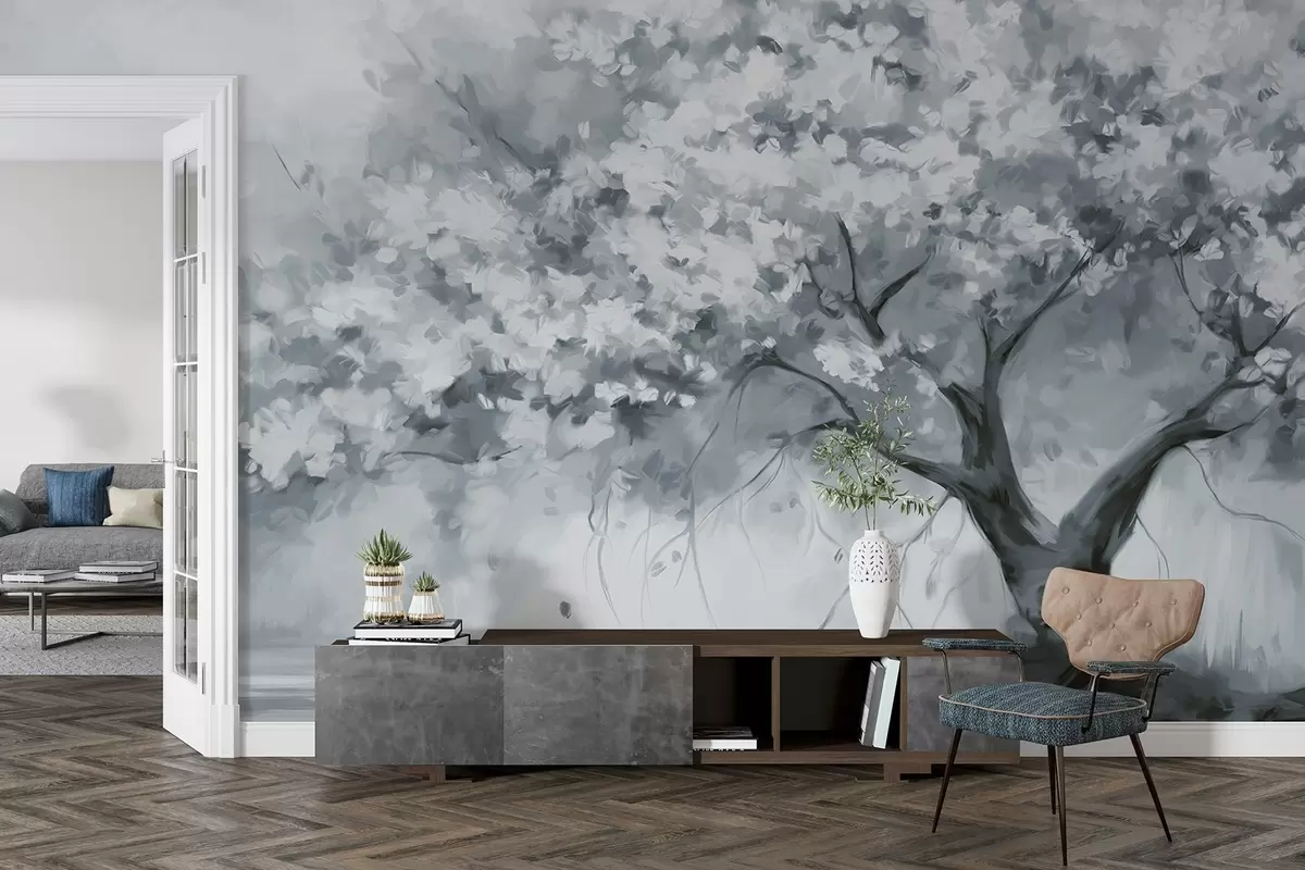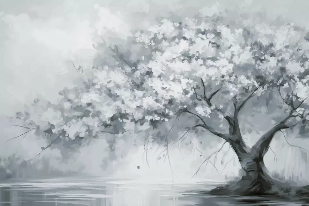 Wall Mural Photo Wallpaper Abstract muted blue blossom tree in full bloom, next to a river, soft textured brushstrokes and pastel colors Nr. w09193v2