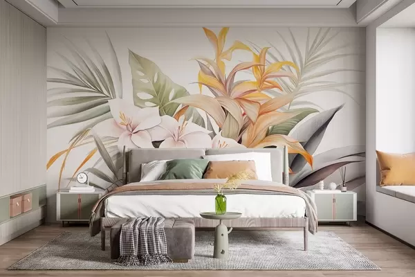 Wall Mural Photo Wallpaper Botanical illustration of tropical flowers with palm and monstera leaves,soft colors, watercolor style Nr. w09201
