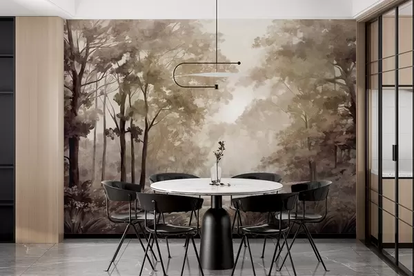 Wall Mural Photo Wallpaper Textured forest landscape, trees with beige and brown leaves, pastel color palette w09210