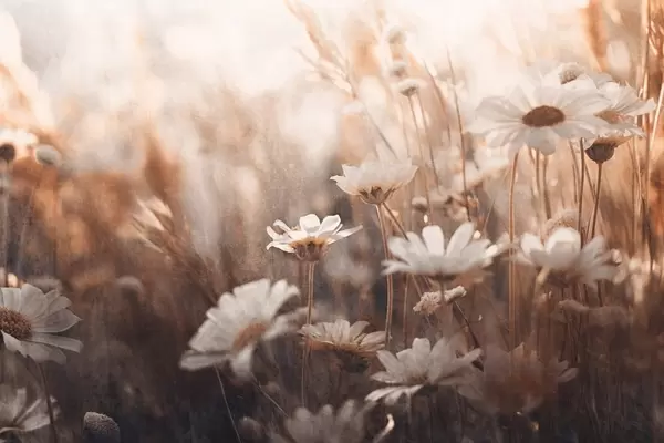Wall Mural Photo Wallpaper Textured field of white daisies and wildflowers in warm color palette with blurred background Nr. w09214