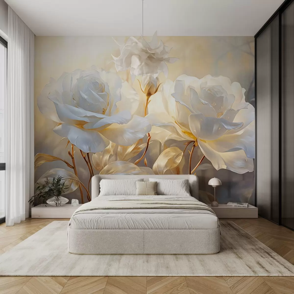 Wall Mural Photo Wallpaper White textured roses with yellow stems and leaves, soft lighting, light background with blurred floral shapes Nr. w09258