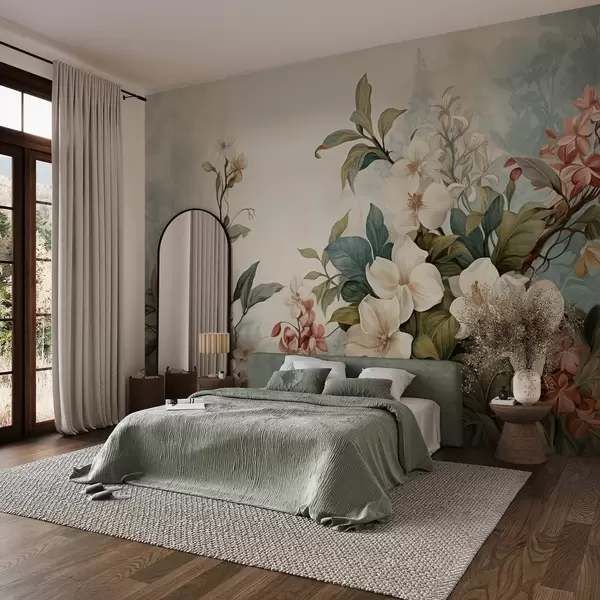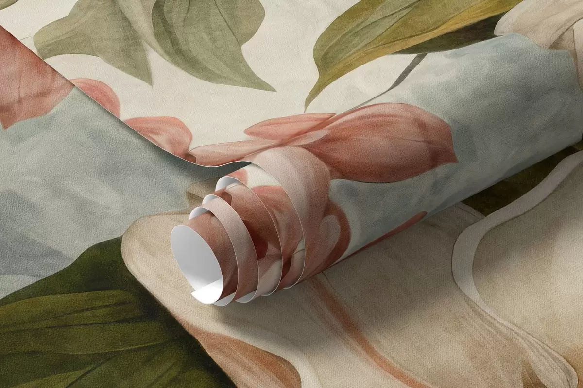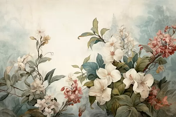 Wall Mural Photo Wallpaper Textured tropical flowers and leaves with soft blue and green hues, delicate brushstrokes, vintage botanical style Nr. w09259