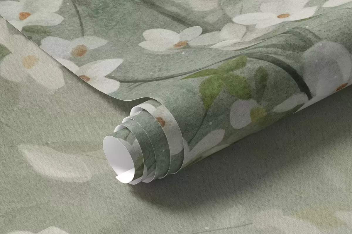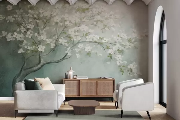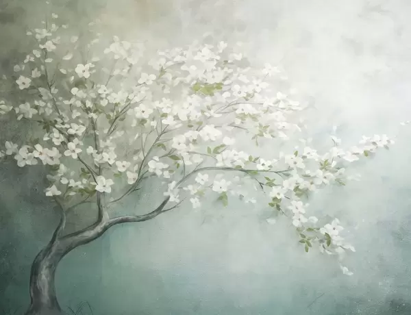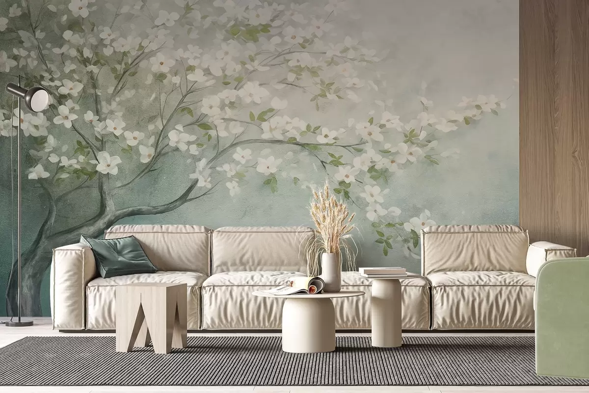 Wall Mural Photo Wallpaper A blooming tree with white flowers in full bloom, against a grainy noisy textured background of muted blue and green Nr. w09261