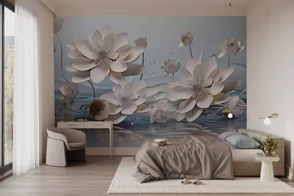 Wall Mural Photo Wallpaper White textured flowers with water drops, reflections on the water surface, light blue background, elegant design w09262
