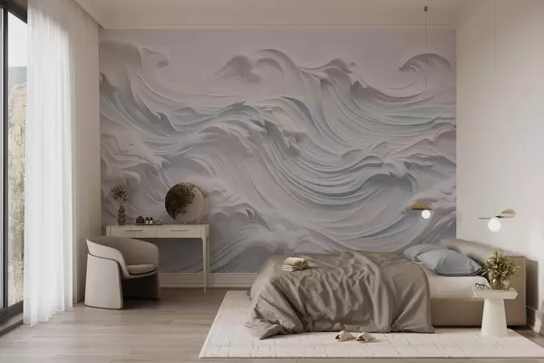 Wall Mural Photo Wallpaper White and light blue textured abstract ocean waves with foam, flowing from left to right, dynamic and textured print Nr. w09266