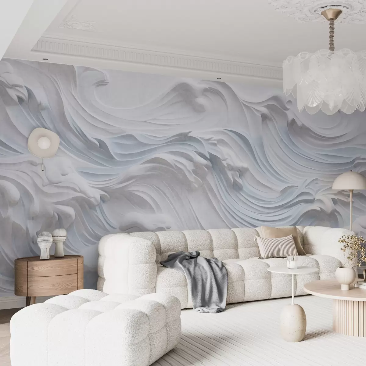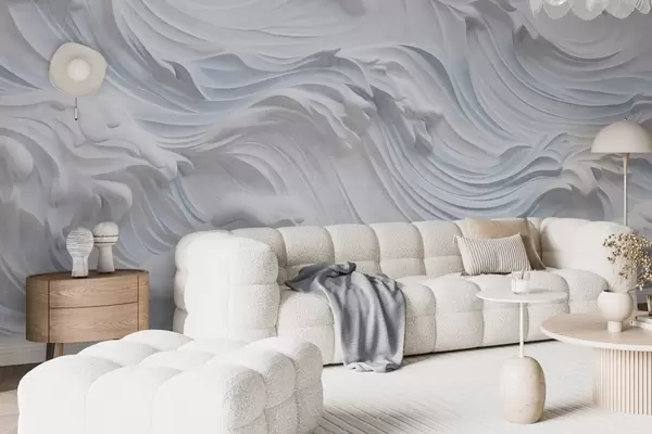 Wall Mural Photo Wallpaper White and light blue textured abstract ocean waves with foam, flowing from left to right, dynamic and textured print Nr. w09266