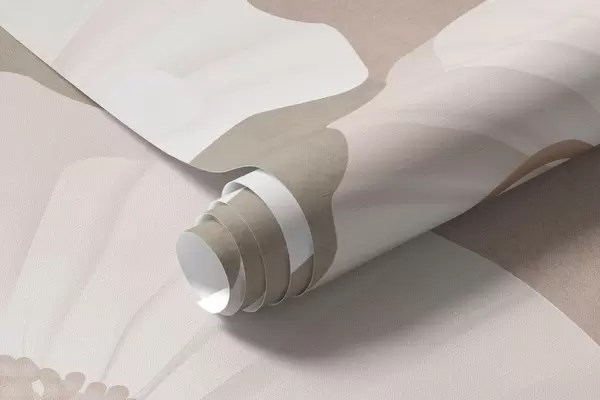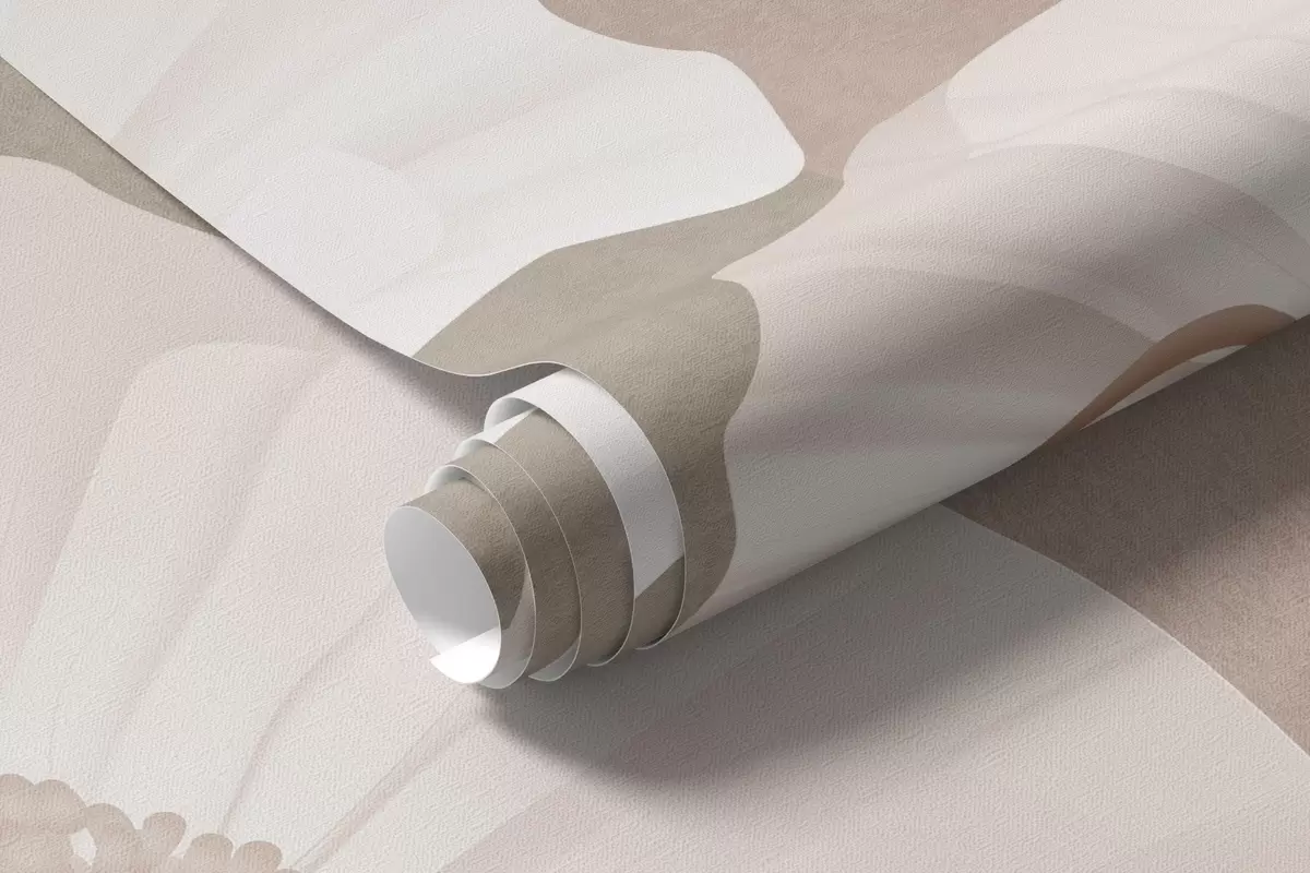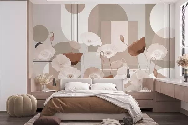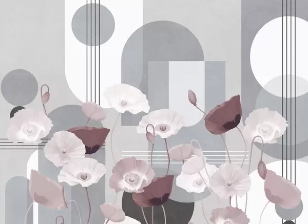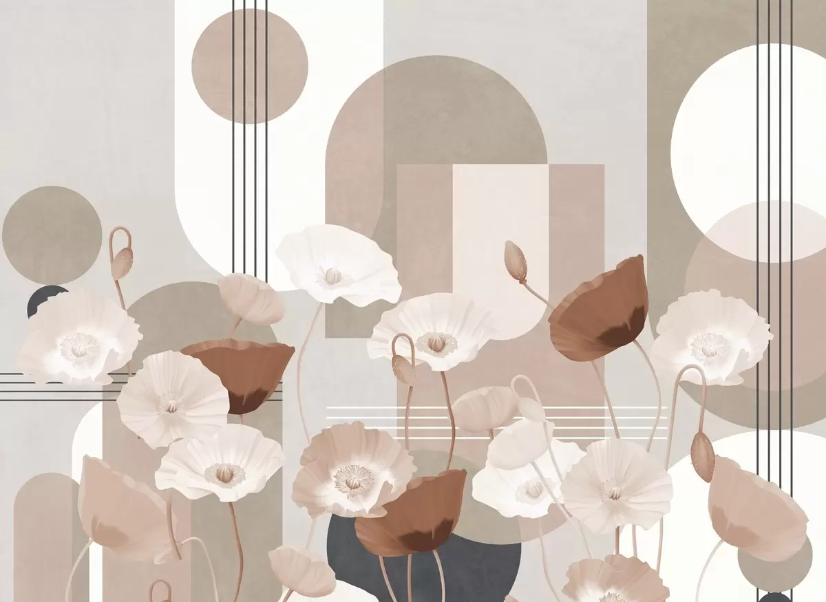 Wall Mural Photo Wallpaper Poppies in white and beige colors with geometric shapes in the background, circles and arches, minimalist style, soft colors Nr. w09289