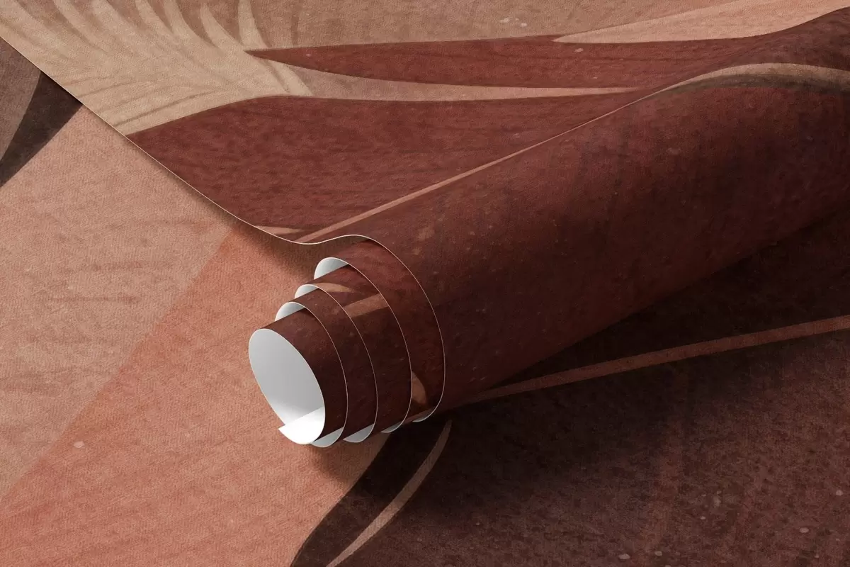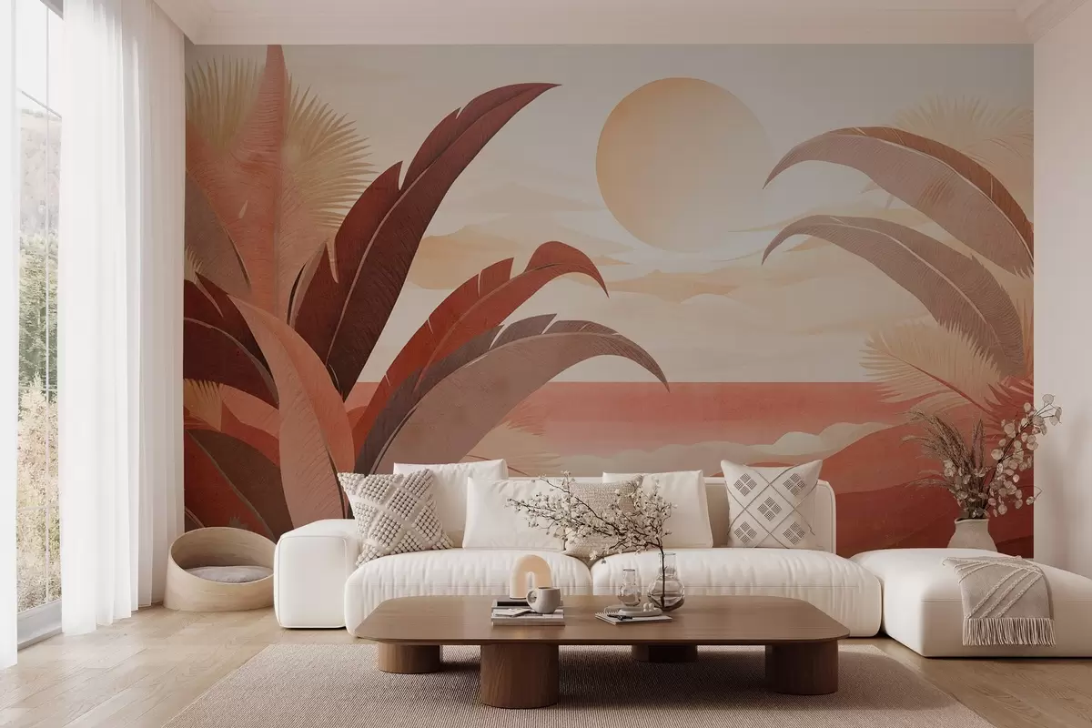 Wall Mural Photo Wallpaper Tropical textured abstract landscape with palm leaves and a big sun in the sky, warm color palette, minimalist style, stylized Nr. w09296