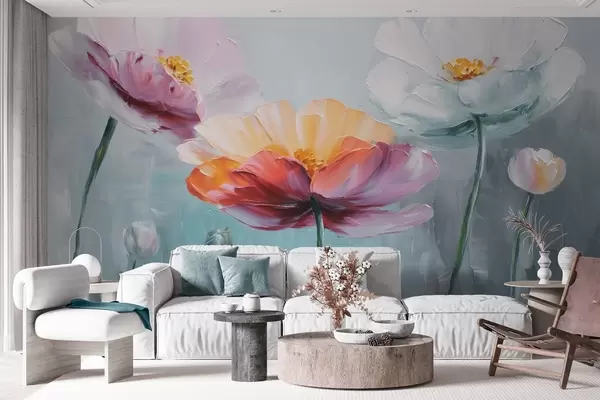 Wall Mural Photo Wallpaper Bright flowers in oil painting technique on a blue background Nr. w09310