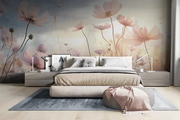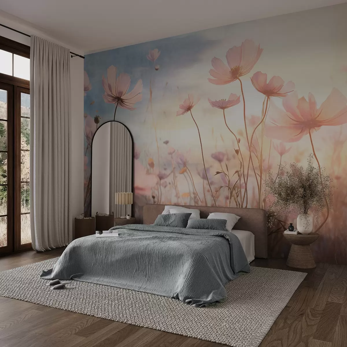 Wall Mural Photo Wallpaper A field of pink textured flowers with long stems, against a soft blue and yellow sky, creating a dreamy atmosphere Nr. w09320