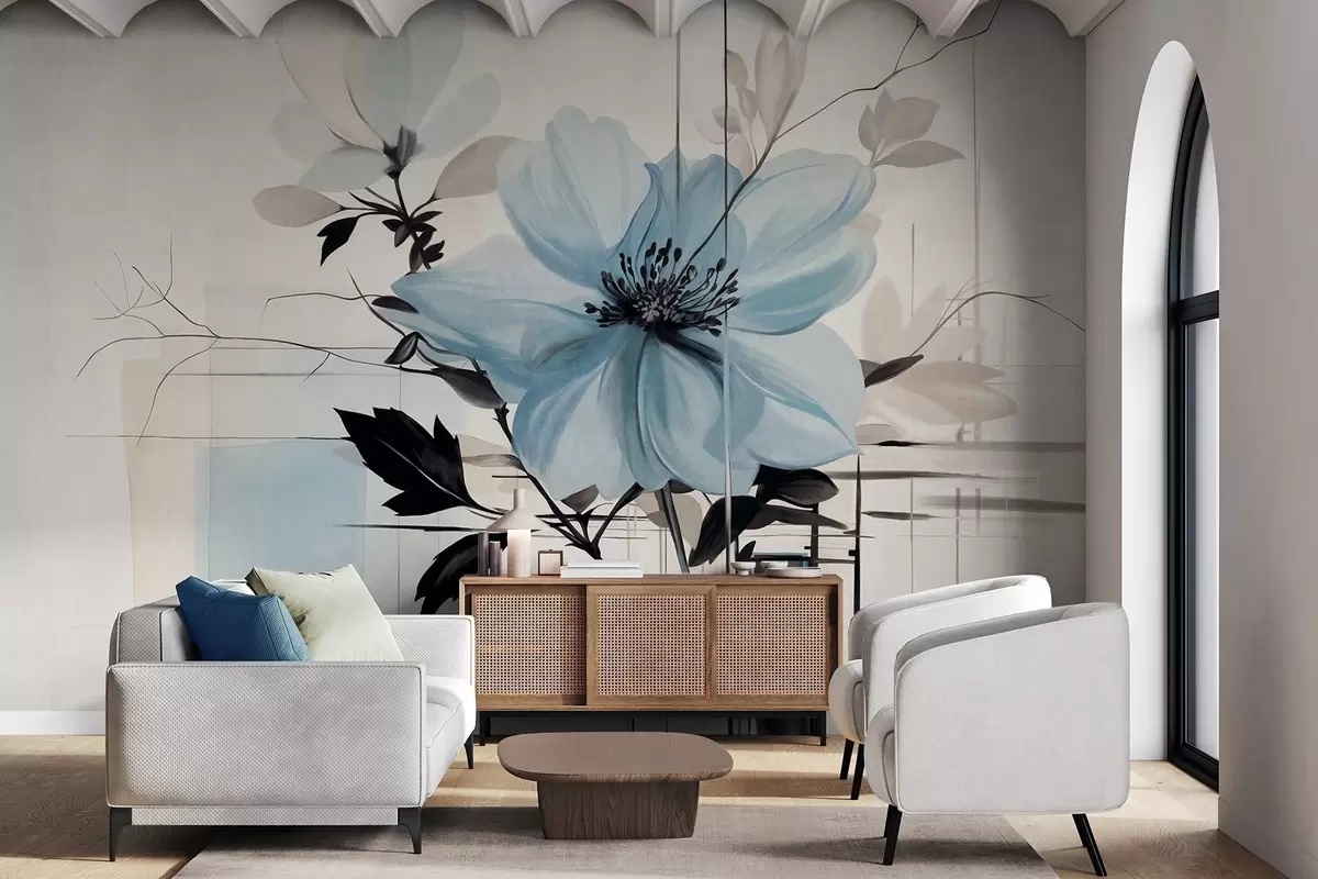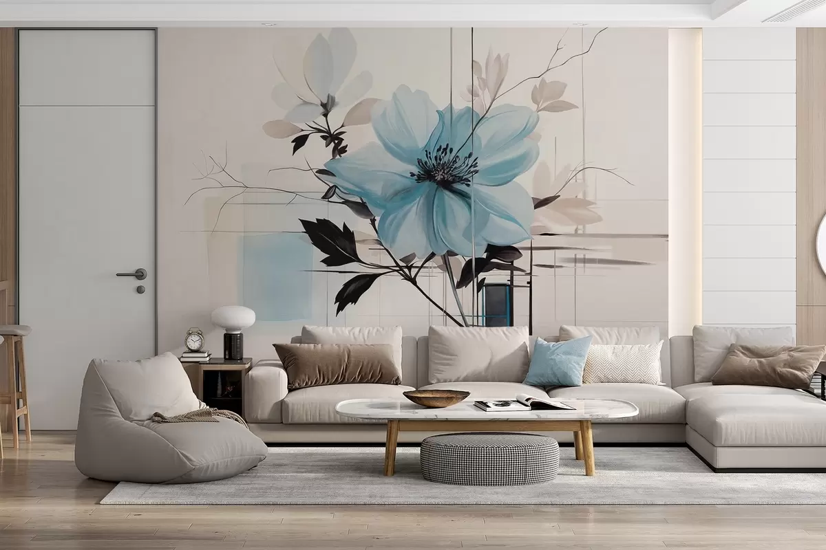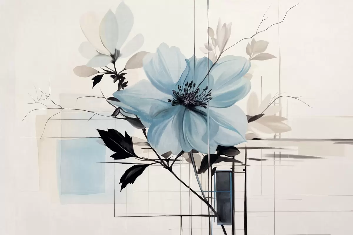 Wall Mural Photo Wallpaper Abstract textured blue flower with dark leaves and branches, geometric minimalistic shapes and lines in muted colors Nr. w09332