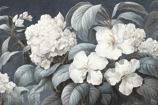 Wall Mural Photo Wallpaper White tropical flowers with delicate petals and leaves in a dark blue background, vintage textured style, botanical illustration Nr. w09334